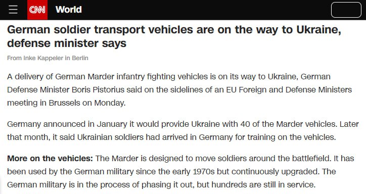 Німеччина розпочала постачання бойових машин піхоти Marder до України. Вони вже перебувають у дорозі, заявив міністр оборони Німеччини Борис Пісторіус.