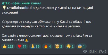 У Києві та області скасовано стабілізаційні відключення світла, що дозволяє повернути електроенергію до будинків усіх мешканців регіону.