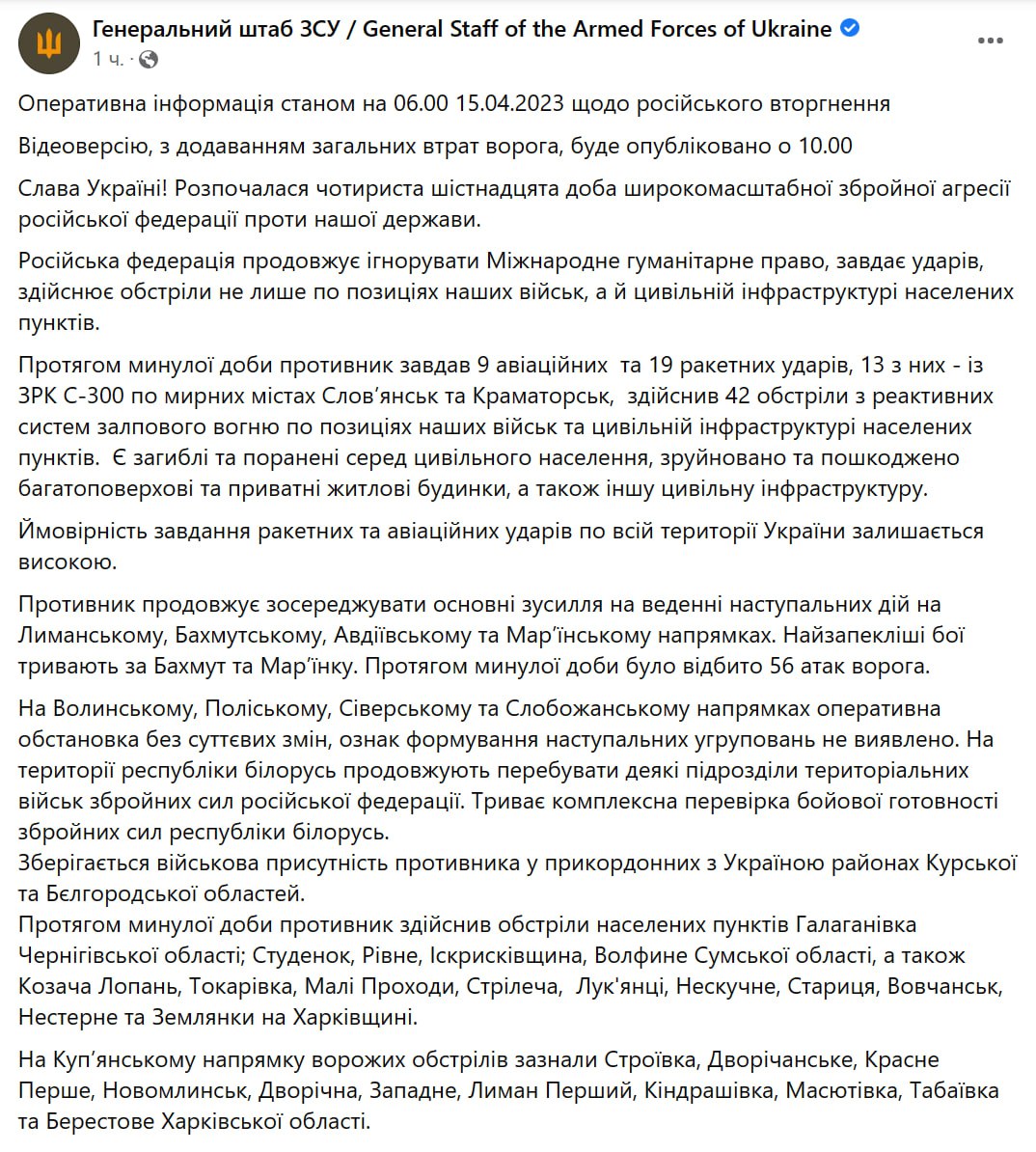 У Генеральному штабі Збройних сил України опублікували оперативне зведення з фронту станом на 6:00 15 квітня. Повідомляється, що українські війська вразили особовий склад та військову техніку окупантів у 5-ти районах. Підрозділи ракетних та артилерійських військ вразили один пункт управління ворога, 3 райони концентрації живої сили, зброї та військової техніки супротивника, а також одну станцію електронного бойового призначення супротивника.