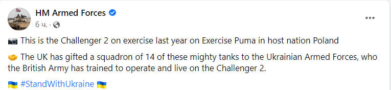 "Великобританія подарувала Україні 14 машин Challenger 2. Інструктори Сполученого Королівства навчили українських військовослужбовців керувати цими танками та використати їх на полі бою", - йдеться у повідомленні.