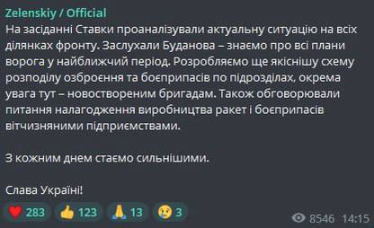 1. Повідомив про засідання Ставки ВГК, де обговорювалися передова та підготовка нових підрозділів для неї, ракетна програма та виробництво боєприпасів.