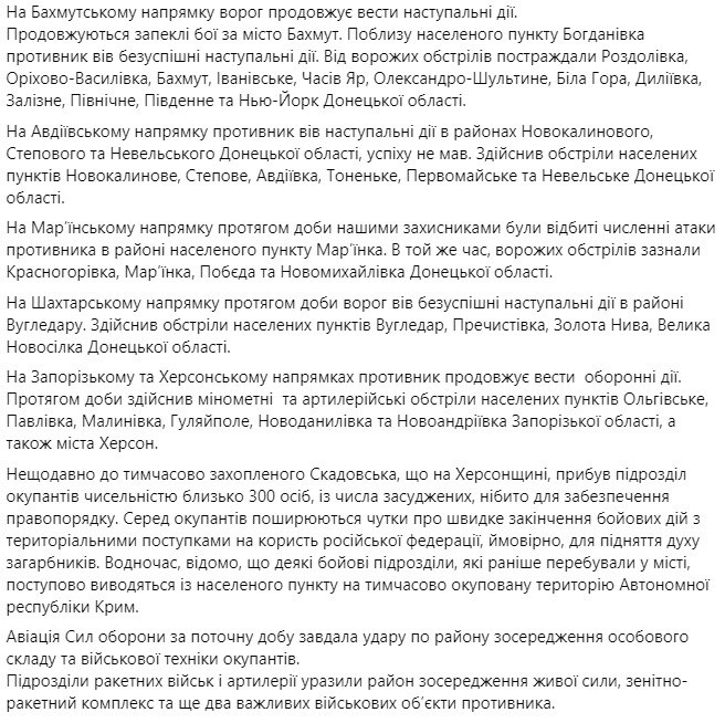 4. Противник зосереджує основні зусилля на веденні наступу на Лиманському, Бахмутському, Авдіївському та Мар'їнському напрямах. Минулої доби на них відбито понад 60 атак противника. Найзапекліші бої ведуться за місто Бахмут.
