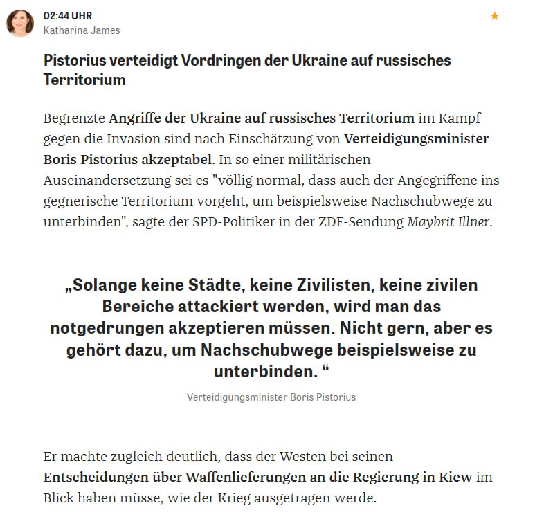 Міністр оборони Німеччини Борис Пісторіус, який заявив, що Києву рано вступати до НАТО вважає допустимим проведення операцій ЗСУ на російській території, якщо вони не несуть загрози цивільним.