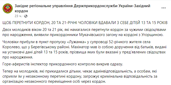 Прикордонники затримали чоловіків, які прикинулися дітьми, щоби виїхати з України. Фото: Facebook