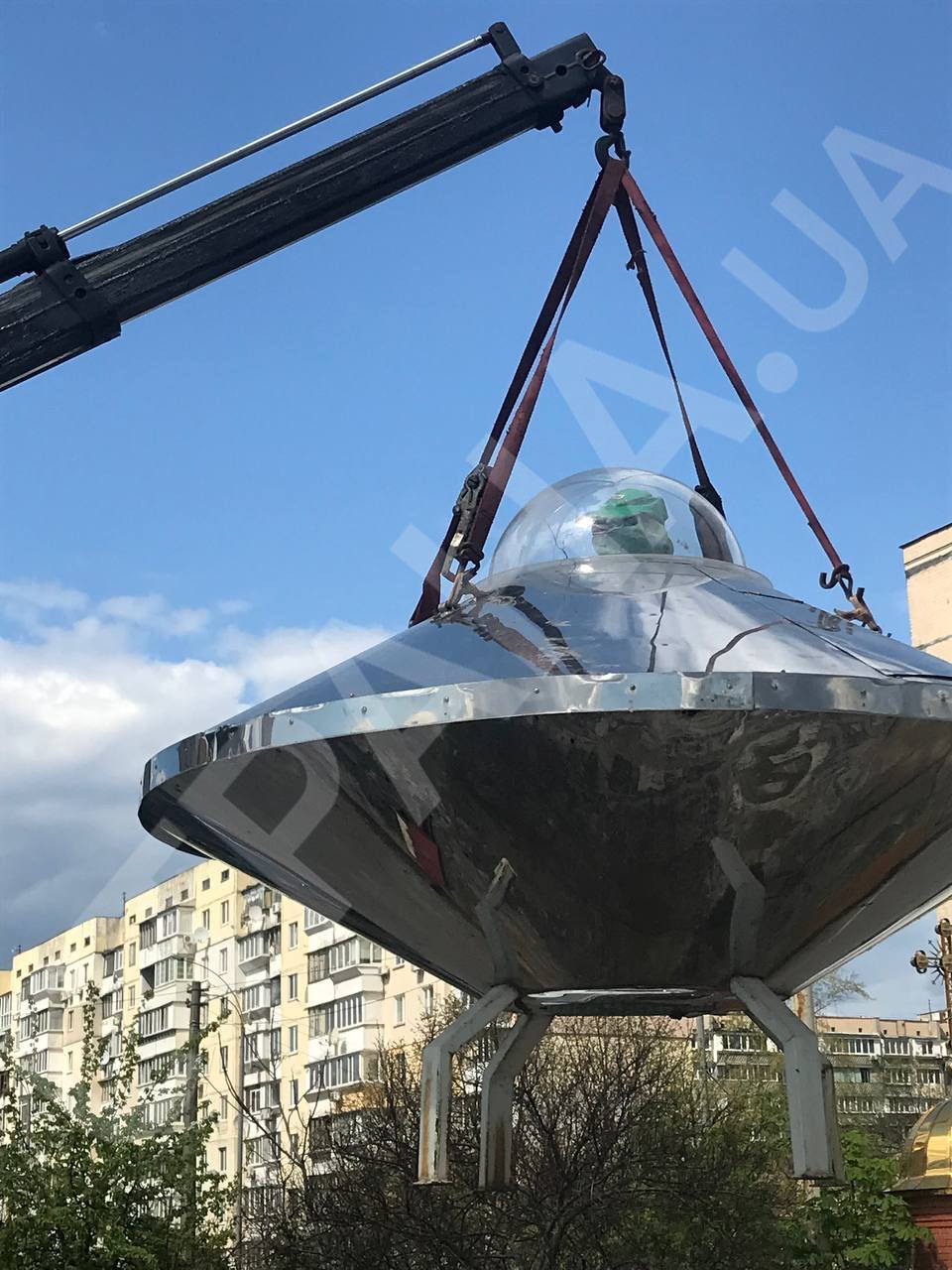 Літаюча тарілка, якою стала зіркою в київських телеграм-каналах у ніч дивного спалаху над столицею, зараз знаходиться на Оболонській набережній у Києві поряд із парком "Наталка". Там вона висить, прикріплена до стріли евакуатора.