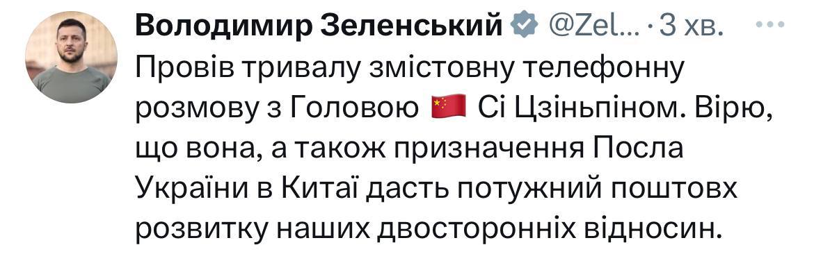 Невдовзі після розмови Зеленський призначив нового посла України у Китаї.