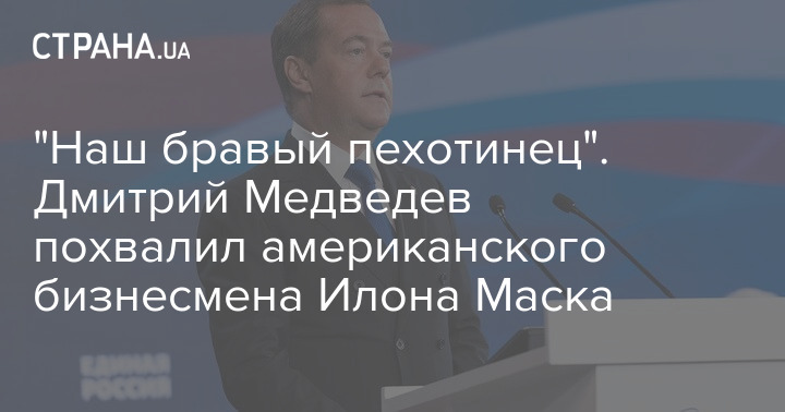 Заступник голови Ради безпеки РФ Дмитро Медведєв назвав у своїй промові засновника "Тесли" та власника "Твіттера" Ілона Маска "нашим бравим піхотинцем".