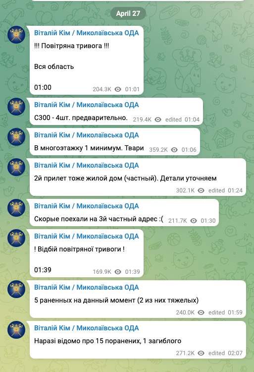 Попередньо губернатор Віталій Кім повідомляв про пуск чотирьох ракет С-300 і приліт в одну багатоповерхівку і два приватні будинки.