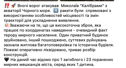 Пізніше речник оперкомандування "Південь" Владислав Назаров опублікував уточнену інформацію. За його даними, РФ атакувала місто чотирма "Калібрамі" з акваторії Чорного моря. Водночас ракети були спрямовані з використанням особливостей місцевості та змін траєкторії для ускладнення виявлення.