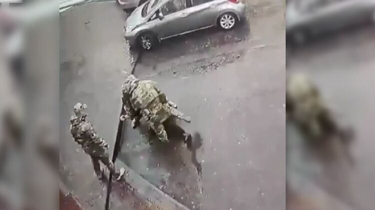 Двоє військових валять чоловіка на землю, а третій б'є його ногою в обличчя.