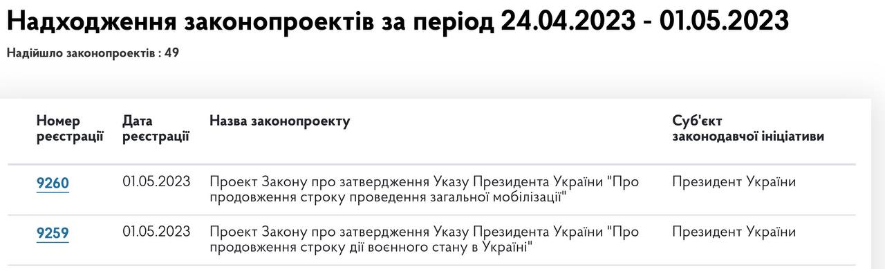 На даний момент текстів законопроектів немає, тому невідомо, на який термін Володимир Зеленський запропонував продовжити військовий стан та мобілізацію.