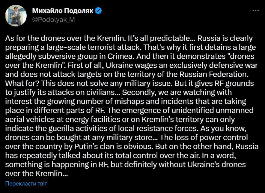 Радник глави Офісу президента Михайло Подоляк слідом за прес-секретарем президента також заявив про непричетність України до ударів по Кремлю. Щоправда, додав застереження, що це може бути справа "місцевих підпільників".