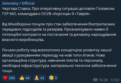 "Почали роботу над комплексною концепцією розвитку нашої авіації з урахуванням переходу на нові типи літаків. Нова організаційна структура, навчання пілотів та персоналу, необхідна інфраструктура, матеріально-технічне забезпечення тощо", - повідомив Зеленський.