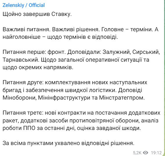 "Щойно завершив Ставку. Важливі питання. Важливі рішення. Головне – терміни. А найголовніше – щодо термінів є відповіді", – написав Зеленський.