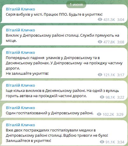 Поранених у Дніпровському та Деснянському районах, за даними медиків, на ранок було 14 людей. Дев'ятеро госпіталізували. П'ятеро отримали допомогу на місці.