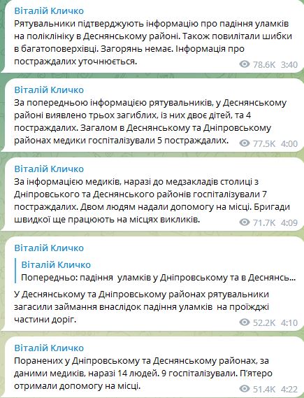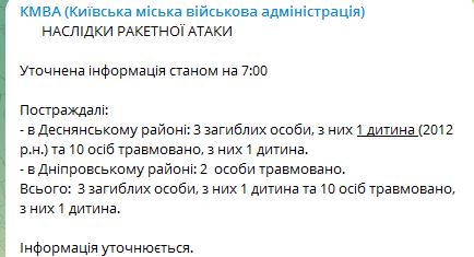 Деснянський район: внаслідок падіння уламків ракети пошкоджено будівлю дитячої поліклініки та прилеглі житлові будинки. Під час ліквідації наслідків було травмовано 10 осіб, серед яких 1 дитина, а також виявлено тіла 3 осіб.