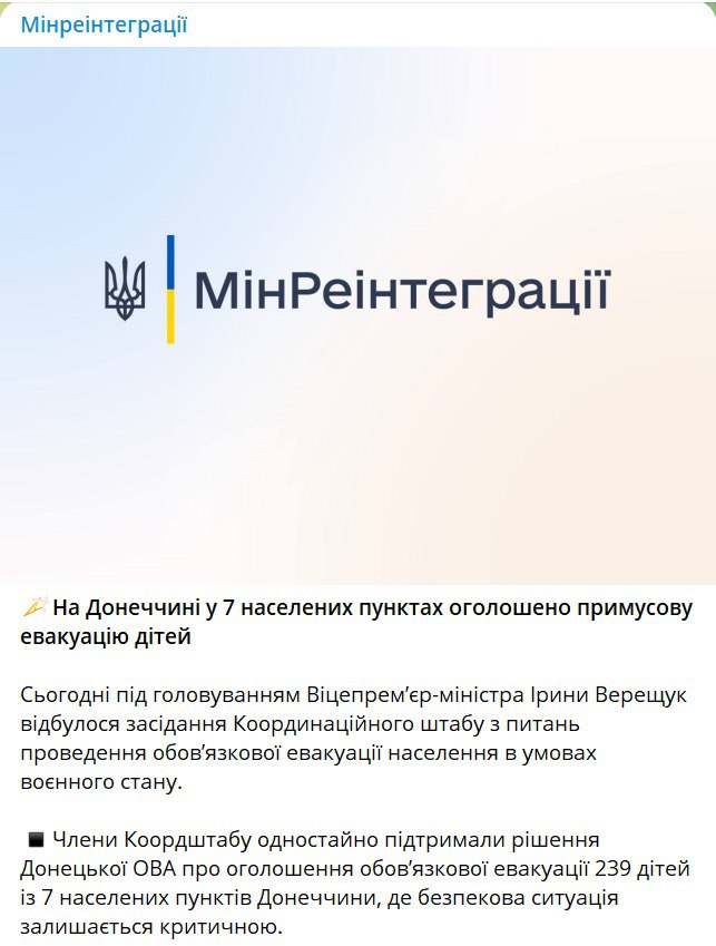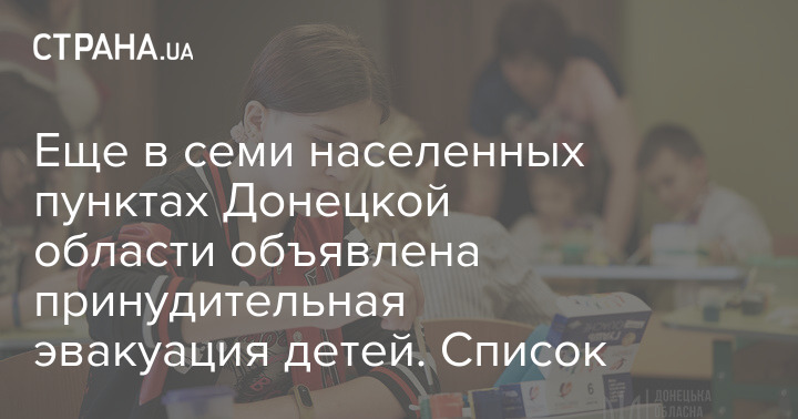 У семи населених пунктах Донецької області оголошено примусову евакуацію дітей: місто Залізне (колишнє Артемове), селища Нью-Йорк і Північне, села Костянтинівка, Іванопілля, Миколаївка, Подільське.