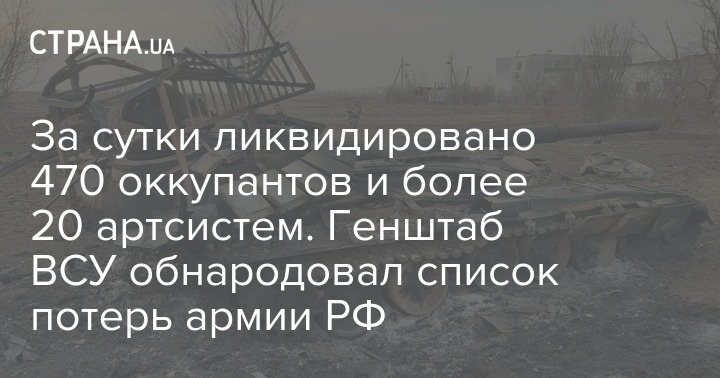 За добу ліквідовано 470 окупантів та понад 20 артсистем. Генштаб ЗСУ оприлюднив список втрат армії РФ