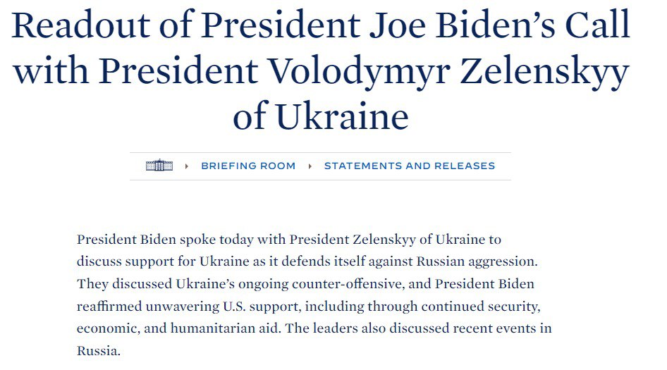 Вони обговорили контрнаступ України, що триває, і президент Байден підтвердив непохитну підтримку США, у тому числі у вигляді постійної допомоги в галузі безпеки, економічної та гуманітарної допомоги.