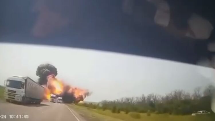 На відео, знятому з реєстратора авто, що їхав зустрічною смугою, можна помітити потужний вибух серед вантажівок, що перевозили найманців.