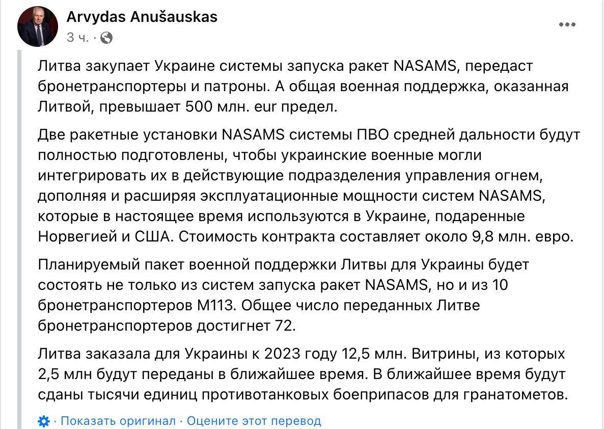 Литва передасть Україні дві пускові установки до систем ППО NASAMS, 10 бронетранспортерів M113, 2,5 мільйона патронів та тисячі одиниць протитанкових снарядів для гранатометів.