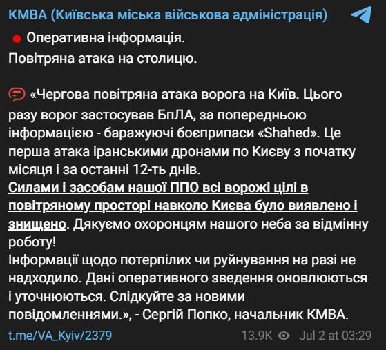 "Чергова повітряна атака противника на Київ. Цього разу ворог застосував БПЛА, за попередньою інформацією – боражі, що барражують, "Shahed". Це перша атака іранськими дронами по Києву з початку місяця і за останні 12 днів", - повідомив керівник міської військової адміністрації Сергій Попко.