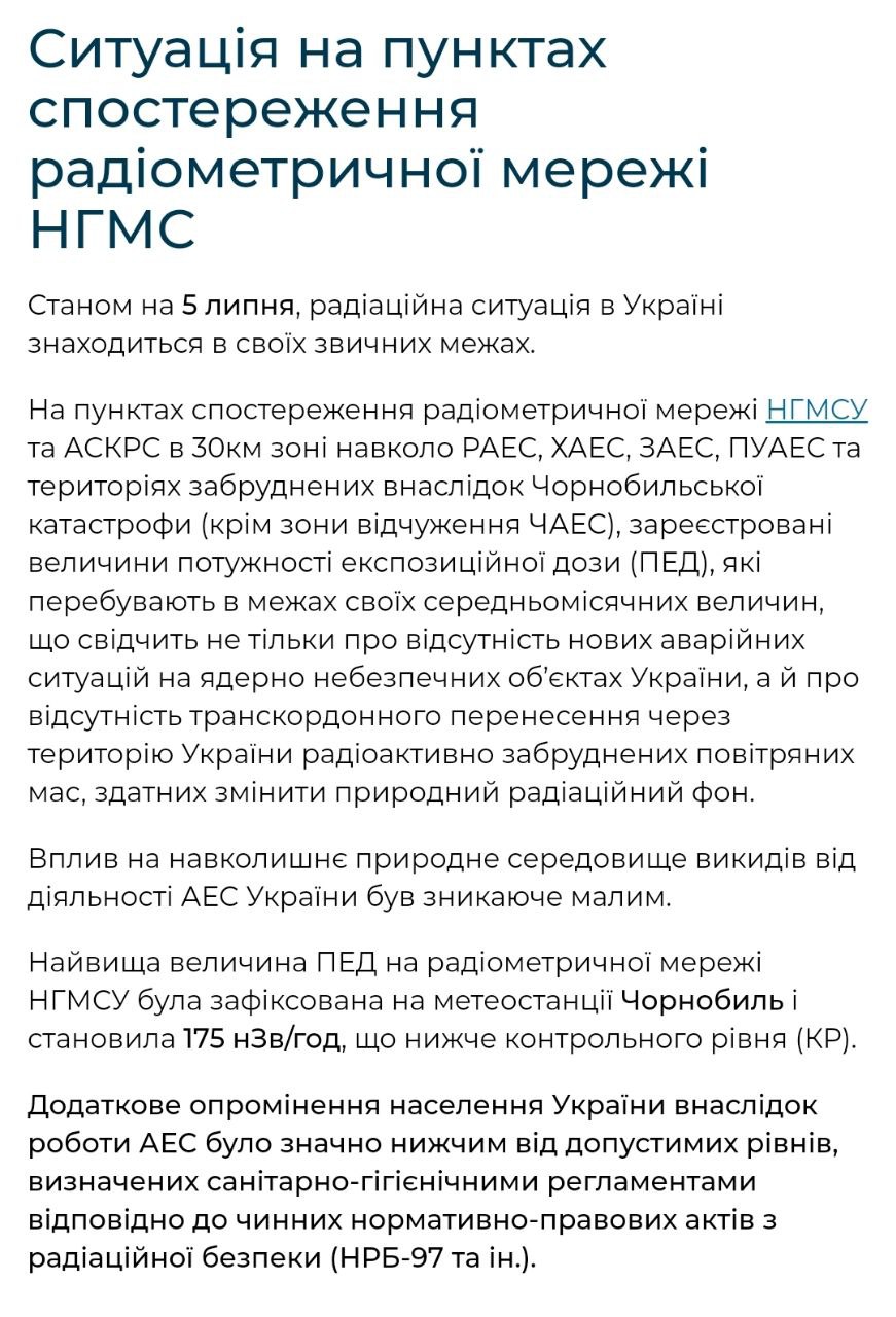 Також станом на 5 липня в Україні не зафіксовано перевищення радіаційного фону.