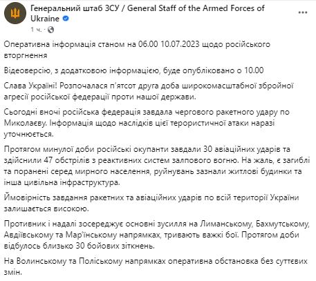 Уранці 10 липня Генштаб ЗСУ оприлюднив зведення про ситуацію на фронті.