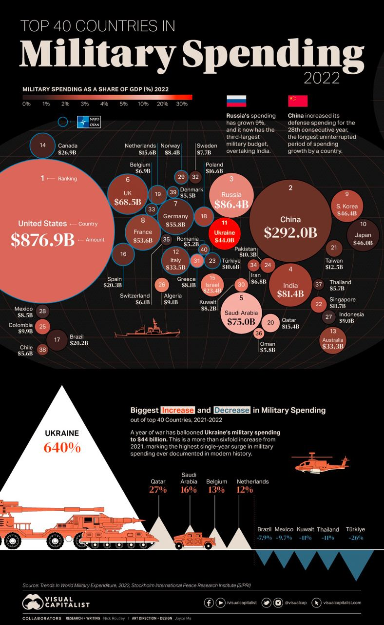 Це найбільший приріст військових витрат у світі не лише минулого року, а й за всю сучасну історію, наголошується в інфографіці Visual Capitalist.