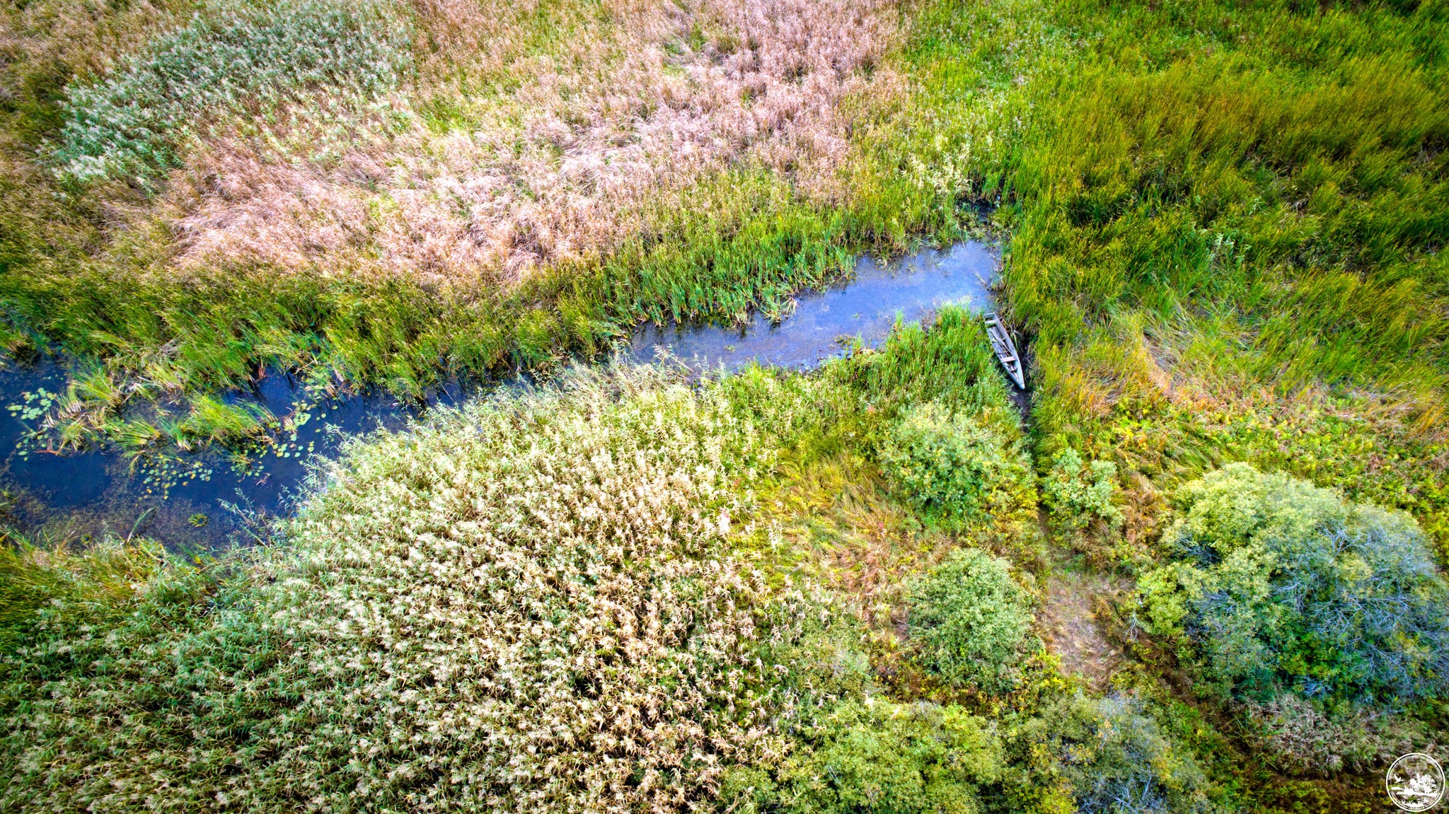 На другій фотографії до кадру потрапили заповідні простори з численними водними артеріями, що потроху заростають болотяною зеленню, серед якої загубився одинокий човен.