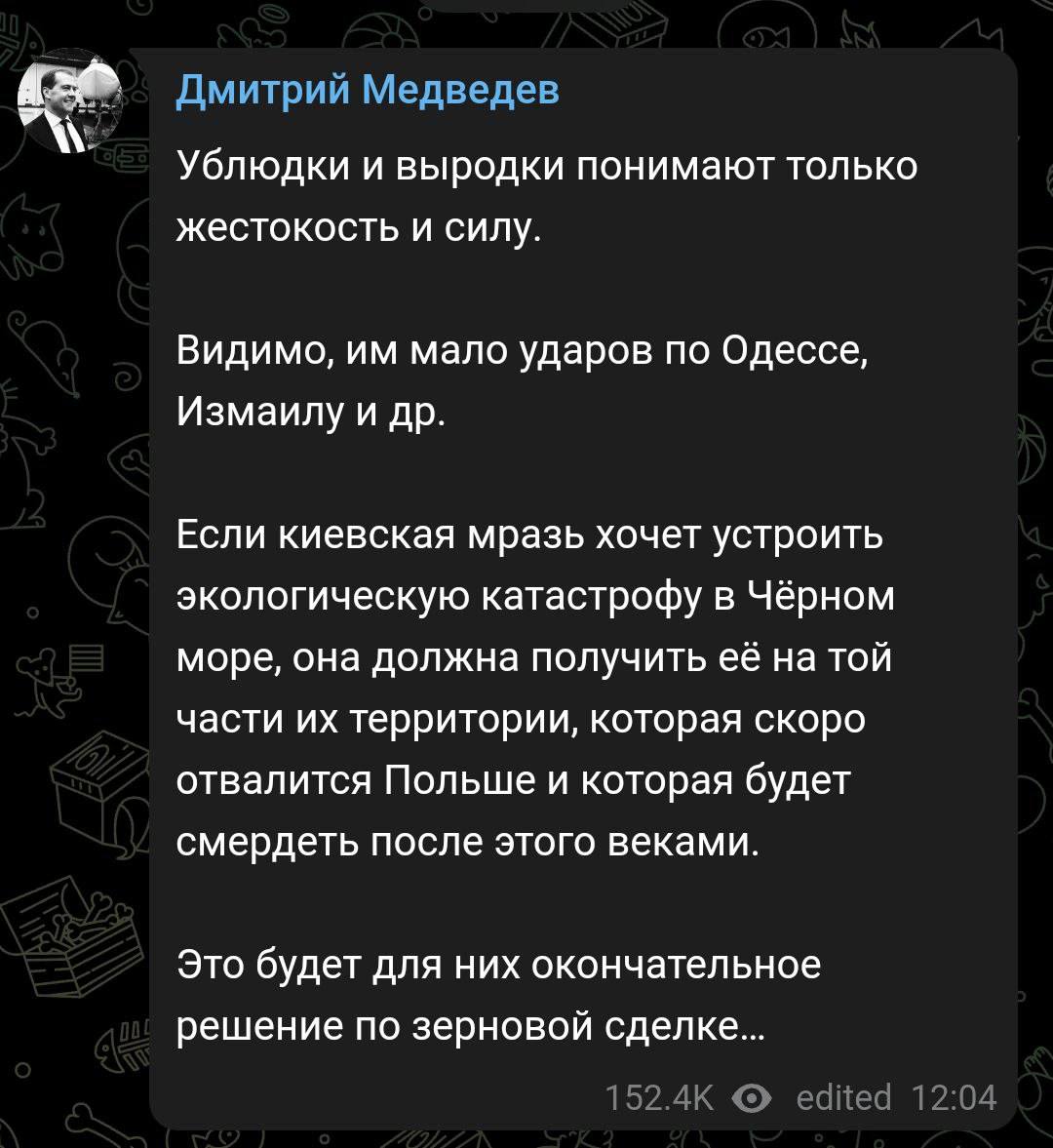 Заступник голови Ради безпеки РФ Дмитро Медведєв після атаки на російський танкер біля Керченської протоки виступив із традиційною заявою з погрозами "удару у відповідь" по Україні.