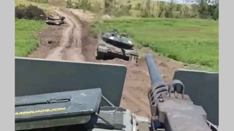 На відео можна помітити, що військовослужбовці ЗСУ їдуть на борту броньованої техніки ґрунтовою дорогою, на узбіччях якої знаходиться два танки Leopard. На одному з них видно сильні сліди кіптяви.