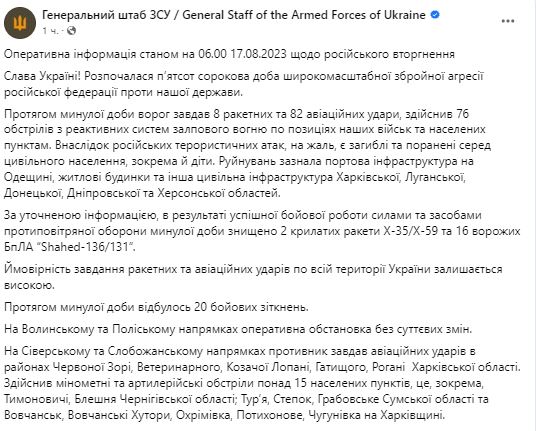 У четвер, 17 серпня, Генштаб ЗСУ оприлюднив зведення про ситуацію на фронті.