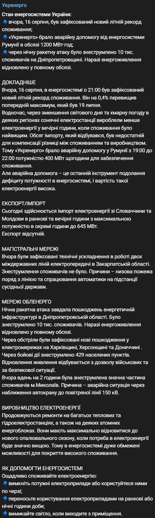 Сьогодні, 17 серпня, виробляється імпорт електроенергії зі Словаччини та Молдови в ранковий та вечірній годинник з максимальною потужністю в окремий годинник до 645 МВт. Експорт відсутня.