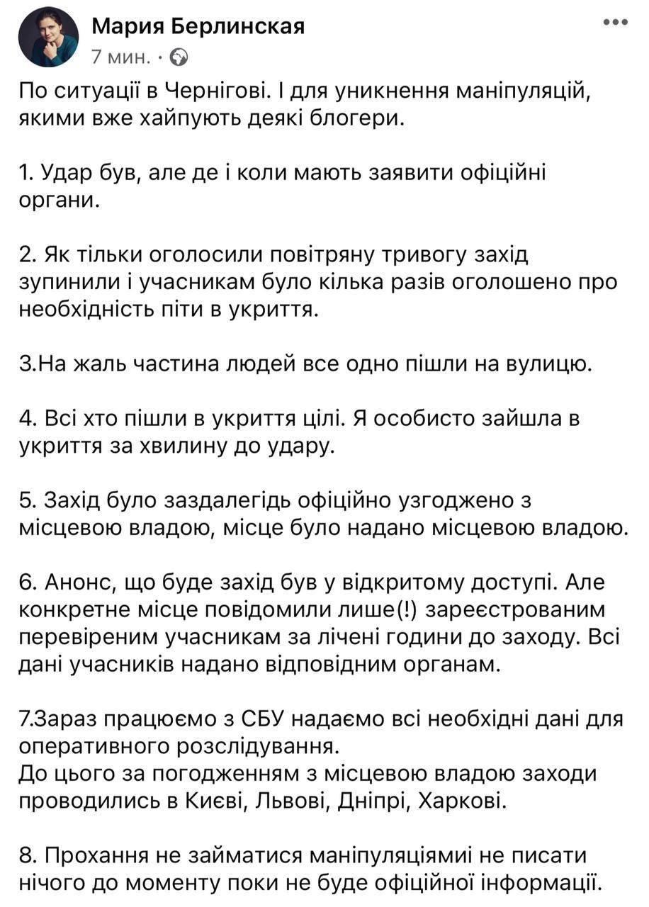 Нагадаємо, після сьогоднішнього обстрілу Чернігова в соцмережах почали звинувачувати організаторів форуму в необережності, яка спричинила загибель семи людей.