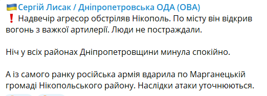 "З самого ранку російська армія вдарила по Марганецькій громаді Нікопольського району. Наслідки атаки уточнюються", - написав Лисак.