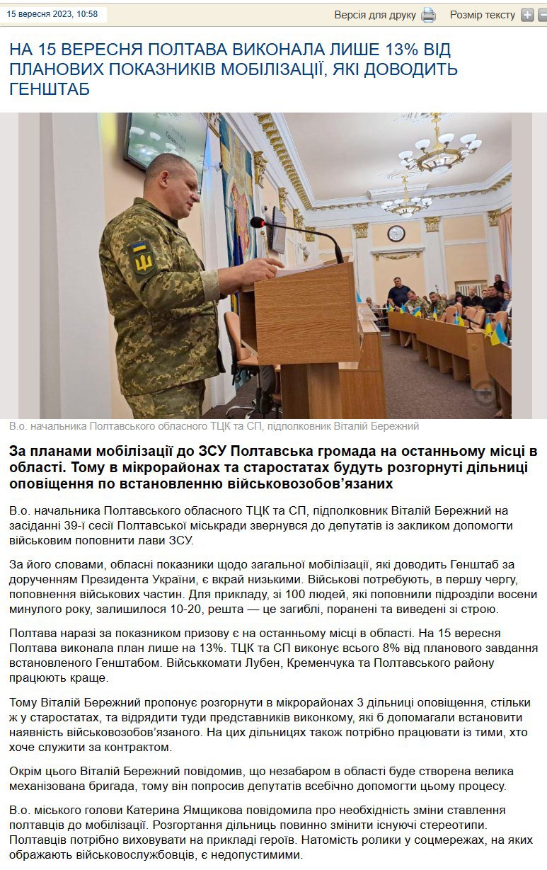 Про це заявив начальник Полтавської обласної ТЦК Віталій Бережний, виступаючи вчора на 39-й сесії Полтавської міськради, пише видання "Полтавщина".