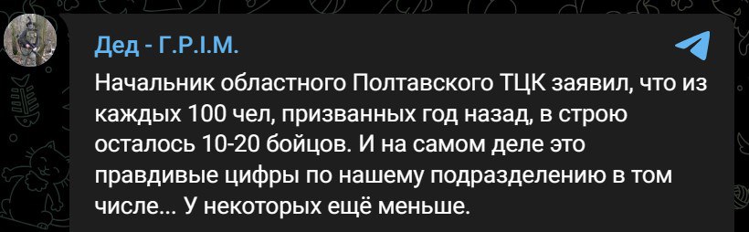 Раніше військком Полтавської області озвучив цифри, за якими на кожні сто мобілізованих залишалося у строю по 10-20 осіб.