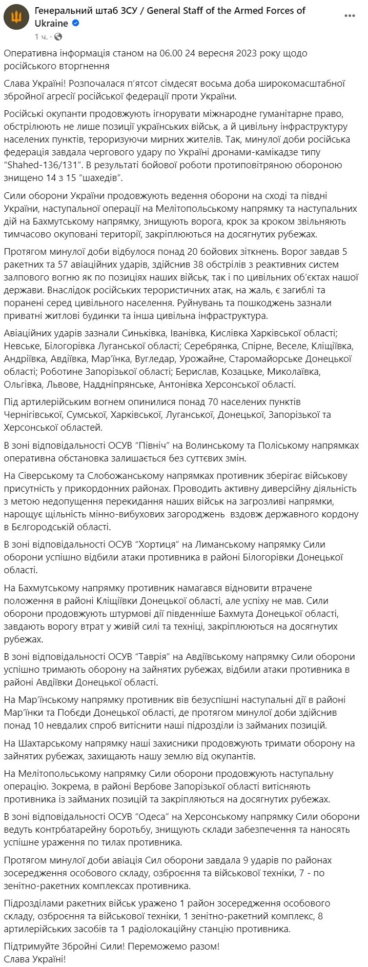 Минулої доби сталося понад 20 бойових зіткнень. Росія завдала 5 ракетних та 57 авіаційних ударів, здійснила 38 обстрілів з реактивних систем залпового вогню за позиціями наших військ та цивільними об'єктами нашої держави.