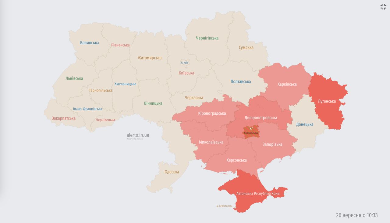 10.35 Повітряні сили попереджають про ракетну загрозу у Харківській, Миколаївській, Херсонській, Дніпропетровській, Запорізькій та Кіровоградській областях.