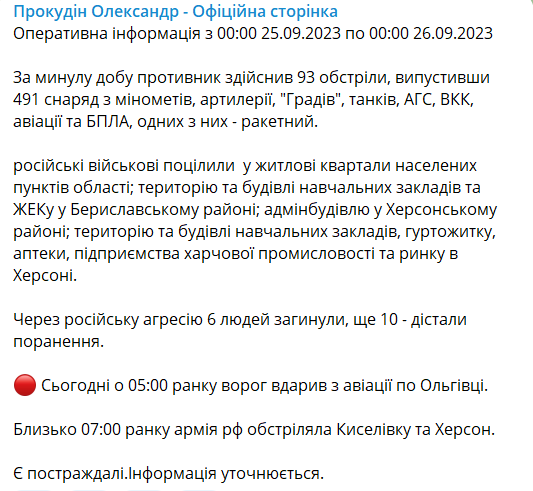 "Сьогодні о 05:00 ранку ворог ударив з авіації Ольговкою. Близько 07:00 ранку армія Росії обстріляла Киселівку та Херсон. Є постраждалі. Інформація уточнюється", - написала Прокудін.