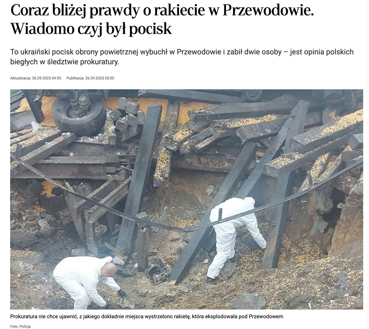 ЗМІ пишуть, що Україна не надала Польщі жодних матеріалів для проведення розслідування, проте слідчі унеможливили, що це була ракета, випущена РФ. Ця ракета має дальність 75-90 км, а російські позиції на той момент були надто далеко. З Білорусі її також не могли випустити.