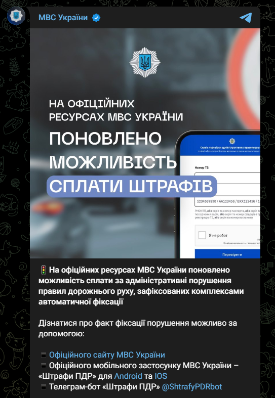 - через телеграм-бот "Штрафи ПДР" (ShtrafyPDRbot).