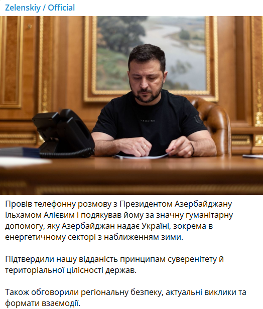 "Подякував йому за значну гуманітарну допомогу, яку Азербайджан надає Україні, зокрема в енергетичному секторі з наближенням зими. Підтвердили нашу відданість принципам суверенітету та територіальної цілісності держав", - написав у повідомленні президент.