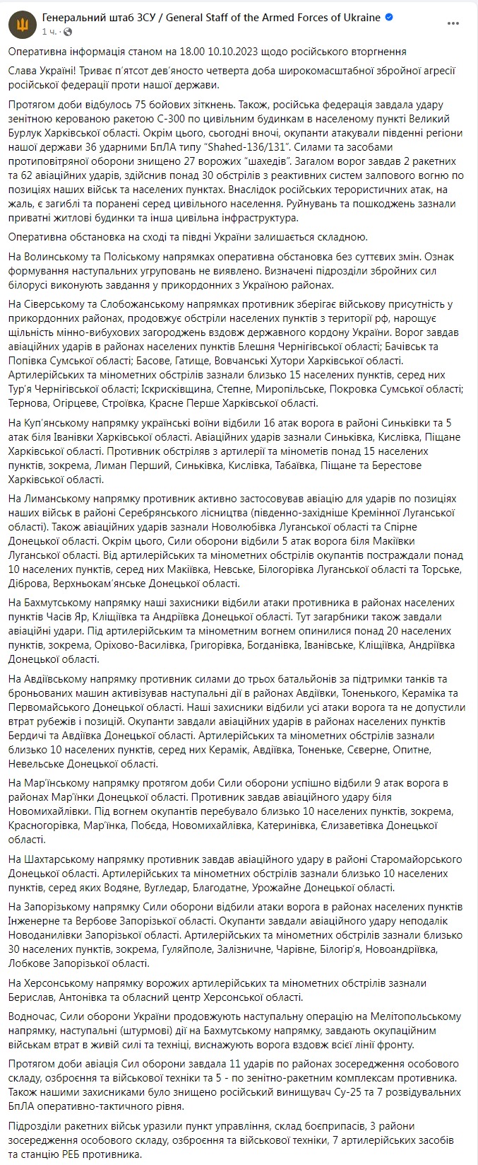 У вівторок, 10 жовтня, в Україні триває 594-й день війни з Росією.