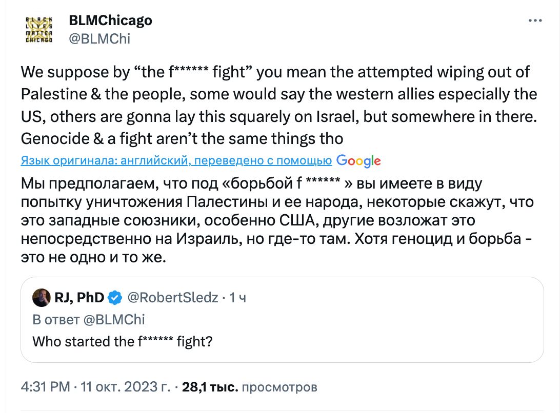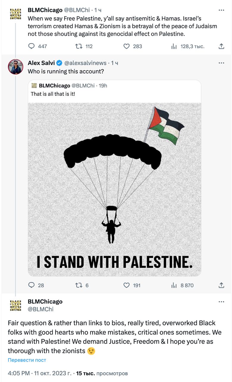 Спочатку активісти BLM запостили у Х картинку з диверсантом ХАМАС на параплані та підписом: "Я підтримую Палестину". Потім її видалили, а користувачі запитали, хто веде цей обліковий запис. У BLM відповіли, що іноді "припускаються помилок", але Палестину все-таки підтримують.