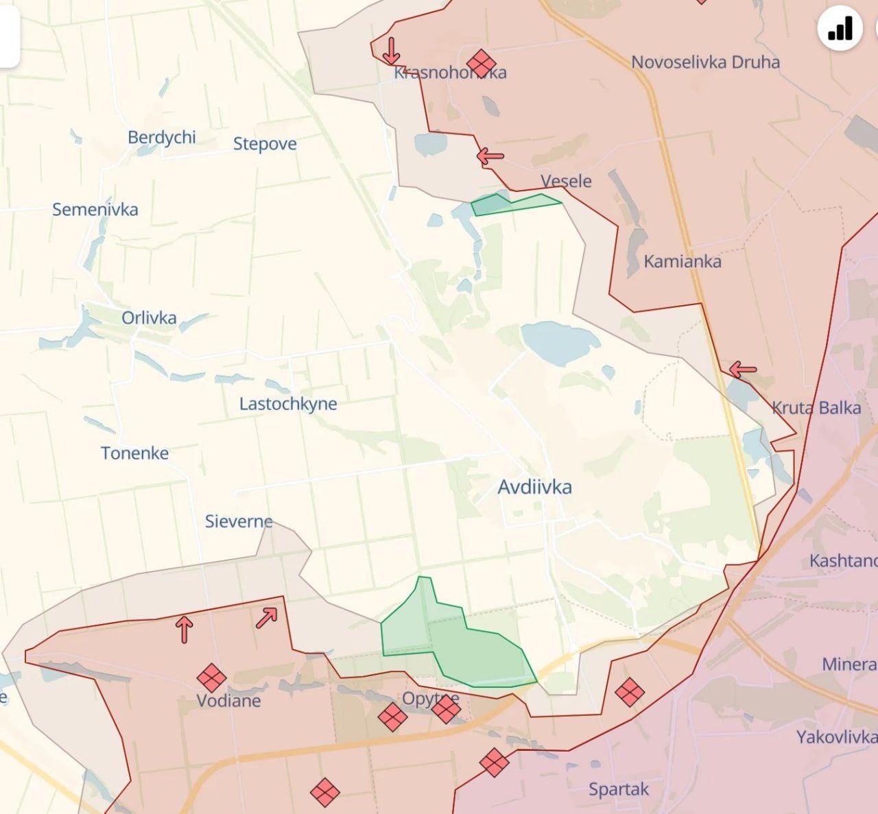 При цьому російські паблики з ночі стверджують, що терикон, розташований поруч із промзоною Авдіївського коксохімзаводу, вже захоплено росіянами. Заявляється, що бої за цю висоту періодично йшли всю війну, оскільки ця зручна точка, з якою прострілюється північний захід Авдіївки.