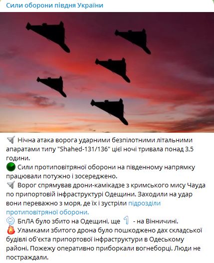 РФ випустила дрони-камікадзе з кримського мису Чауда за припортовою інфраструктурою Одеської області. Заходили на удар вони з моря, де їх зустріли підрозділи ППО.