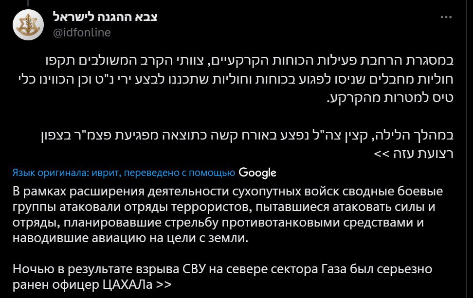 Також учора в ЦАХАЛі повідомили, що ізраїльська армія увійшла до північної частини Гази.
