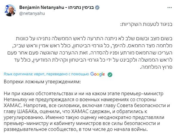 Нетаньягу звинуватив ізраїльську розвідку за те, що та не попередила його про атаку ХАМАС, але потім зніс допис